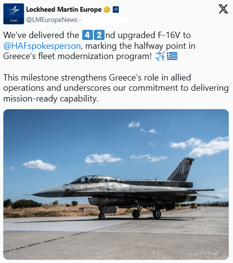 Me një postim enigmatik, Lockheed Martin, kontraktori kryesor në programin për përmirësimin e avionëve luftarakë F-16 Block 52+ në nivelin Viper, njoftoi solemnisht dorëzimin e F-16-it të 42-të në Forcën Ajrore Greke, duke theksuar se “duhet të jetë gati për të gjitha llojet e misioneve aleate”.