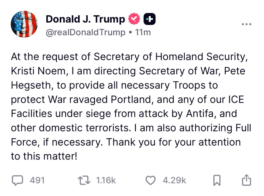 “I kam urdhëruar Sekretarit të Mbrojtjes Pete Hegseth të vendosë të gjitha trupat e nevojshme për të mbrojtur Portlandin, i cili është shkatërruar nga lufta dhe objektet tona të ICE (policia e imigracionit), të cilat janë nën rrethim nga anëtarët e Antifas dhe terroristë të tjerë vendas.”