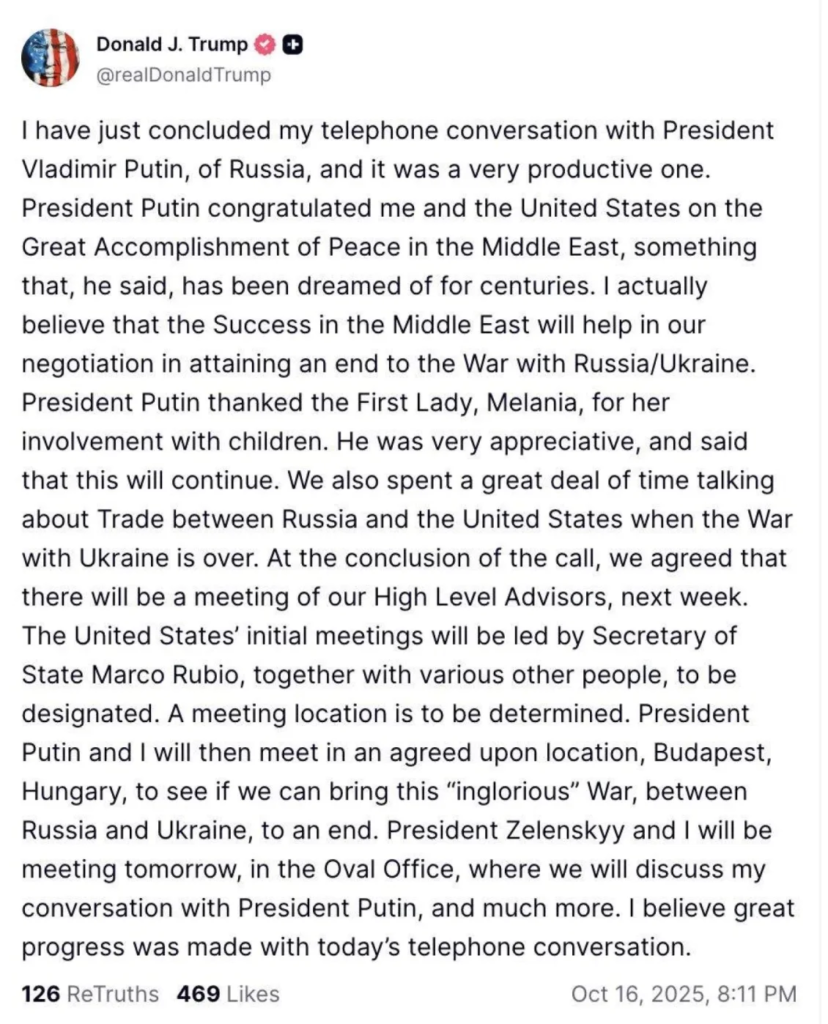 “Sapo përfundova bisedën time telefonike me Presidentin Vladimir Putin të Rusisë, e cila ishte shumë produktive. Presidenti Putin më përgëzoi mua dhe Shtetet e Bashkuara për Arritjen e Madhe të Paqes në Lindjen e Mesme, diçka që ai tha se e kishte ëndërruar për shekuj. Unë besoj vërtet se Suksesi në Lindjen e Mesme do të ndihmojë në negociatat tona për të arritur fundin e luftës me Rusinë dhe Ukrainën.
