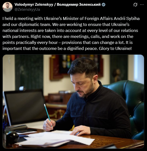 “Pata një takim me Ministrin e Jashtëm ukrainas Andrij Sibikha dhe ekipin tonë diplomatik. Po punojmë për të siguruar që interesat kombëtare të Ukrainës të merren parasysh në çdo nivel të marrëdhënieve tona me partnerët tanë. Për momentin, pothuajse çdo orë ka takime, telefonata dhe diskutime mbi pika që mund të ndryshojnë shumë. Është e rëndësishme që rezultati të jetë një paqe e mirë. Lavdi Ukrainës!”
