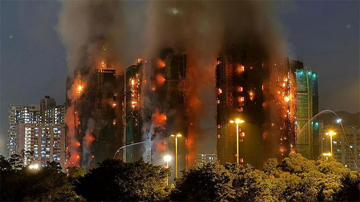 Videot tregojnë flakët që përfshijnë skelat prej bambuje që mbulonin pjesën e jashtme të shumë apartamenteve, ndërsa pjesë të rrjetës mbrojtëse të gjelbër u shembën dhe u dogjën deri në themel.