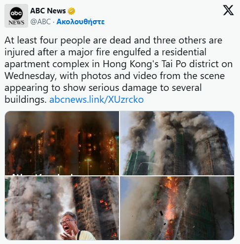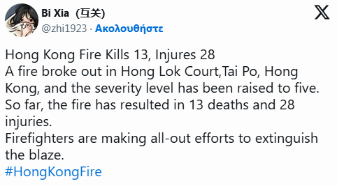 Të paktën 13 persona, përfshirë një zjarrfikës, kanë vdekur në një zjarr të madh që shpërtheu në lagjen Tai Po të Hong Kongut. Flaka përfshiu të gjithë kompleksin Wang Fuk Court, i përbërë nga tetë ndërtesa, me shumë banorë të bllokuar në apartamentet e tyre. Autoritetet thonë se ende nuk ka një pamje të qartë të numrit të njerëzve që mund të mbeten brenda ndërtesave.