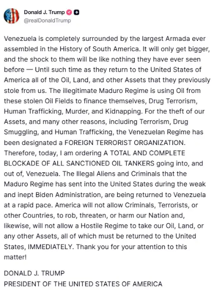 Në një postim në Truth Social, të martën në mëngjes (17/12/2025), Donald Trump njoftoi bllokadë të plotë detare ndaj Venezuelës, duke pretenduar se vendi është një qendër për trafikimin e drogës në Shtetet e Bashkuara.