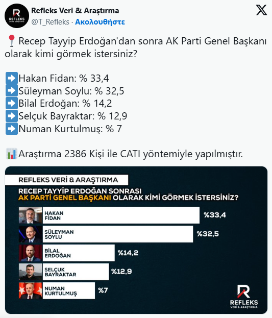 Ministri i Jashtëm Hakan Fidan dhe ish ministri i Brendshëm i fuqishëm dhe famëkeq Sulejman Sojlu po dalin si favoritë për t’u bërë udhëheqësi i ardhshëm i AKP-së. Të dy kanë një gjurmë të fortë në shtet dhe u bëjnë thirrje votuesve që duan vazhdimësi, stabilitet dhe siguri pas Erdoganit.