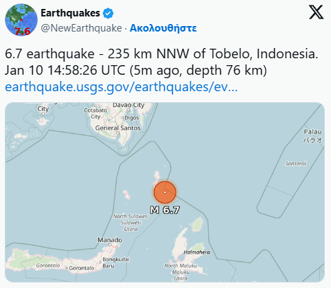 Një tërmet i fortë me magnitudë 6.7 ballë u regjistrua sot pranë brigjeve të grup-ishujve Talaun, në Indonezi, duke shkaktuar shqetësim në rajonin më të gjerë.