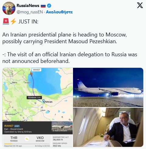 An Iranian government plane landed at Moscow's Vnukovo airport amid rumors of US strikes on Iran. Iranian President Masoud Pezeshkian or an Iranian delegation may be on board. Monitoring channels also report that US planes involved in… https://t.co/cTImnWsj9n pic.twitter.com/LqmClNhzmg