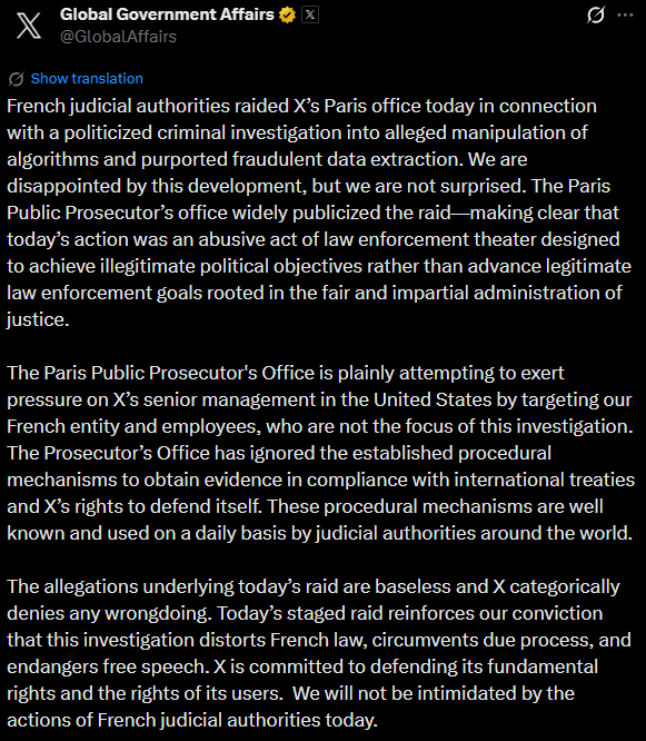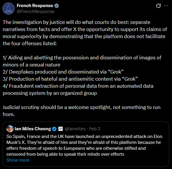 Zyra e prokurorit të Parisit po heton platformën për ndryshime algoritmi, nxjerrje të paligjshme të të dhënave, pornografi të fëmijëve dhe deepfake seksuale. Musk ka akuzuar hetimin se është publikuar për “qëllime të paligjshme politike”.