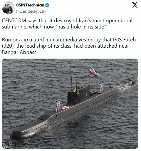 Komanda Qendrore e SHBA-ve (CENTCOM) njoftoi se forcat amerikane bombarduan dhe çaktivizuan nëndetësen iraniane IRIS Fateh (920) klas KILO-klas.