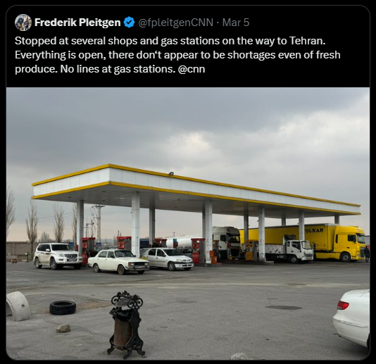 Në një postim tjetër gazetari i CNN-it na tregon një benzinatë në Teheran, duke na thënë se gjithçka është e hapur, nuk ka mungesë produktesh, bile ka produkte të freskëta.