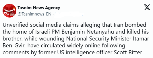 Raporti u bazua gjithashtu në një pretendim që i atribuohej ish oficerit të inteligjencës amerikane Scott Ritter (siç raportohet nga media ruse). Sipas këtij rrëfimi, Irani dyshohet se bombardoi strehën e Netanyahut, duke vrarë vëllain e tij. Edhe vetë Tasnim, megjithatë, pranoi se ky spekulim nuk është konfirmuar zyrtarisht.