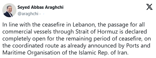 Hapja e Ngushticës së Hormuzit është e lidhur edhe me armëpushimin 10-ditor të shpallur nga Presidenti i SHBA-ve Donald Trump, për të kënaqur “krenarinë” e Iranit të ronitur, i cili u pranua si nga Libani ashtu edhe nga Izraeli.