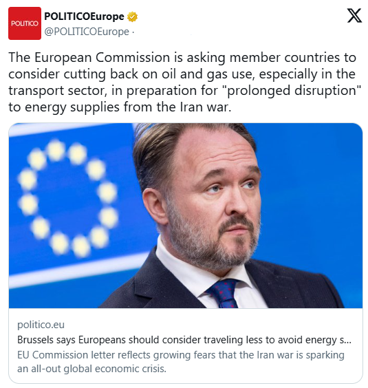 Në një deklaratë që të kujton një komunikatë të kohës së luftës, Komisioneri Europian i Energjisë, Dan Jorgensen, u bëri thirrje miliona punëtorëve të kthehen në punën e distancës dhe të braktisin makinat e tyre, ndërsa energjia bëhet luks.