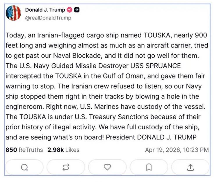 Sipas njoftimit, shkatërruesi USS Spruance e gjeti dhe e ndërpreu anijen e mallrave Touska, e cila po shkonte drejt Iranit. Forcat amerikane lëshuan paralajmërime të përsëritura për ekuipazhin, duke theksuar se po shkelte bllokadën, duke i bërë thirrje atij të zbatonte.