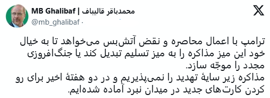 Përgjigja nga Irani ishte “po” e ashpër dhe plot me aludime për një raund të ri tmerri. Kryetari i parlamentit, Mohammad Bagher Ghalibaf, në një postim pa frymë, deklaroi se Teherani nuk do të dorëzohej përpara një situate kërcënimesh. Ai akuzoi Trumpin se po përpiqet ta shndërrojë tryezën e negociatave në një “tryezë dorëzimi” dhe zbuloi se Irani është përgatitur prej dy javësh për të paraqitur “karta të reja” në fushën e betejës.