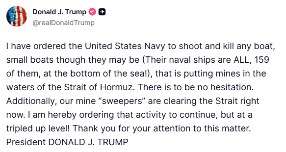 Me një postim që “dogji” Truth Social, Presidenti Amerikan dha dritën jeshile për shfarosjen totale të kujtdo që guxon të vendosë mina në Ngushticën e Hormuzit. Donald Trump, pa asnjë shenjë hezitimi, urdhëroi Marinën Amerikane të fundoste çdo anije, pavarësisht madhësisë, që zbulohet duke “mbjellë” vdekje në ujëra.