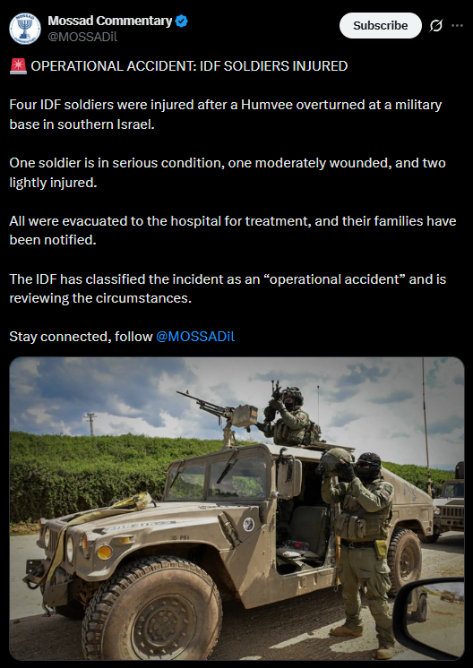 Gjithashtu, katër ushtarë të Forcave të Mbrojtjes Izraelite (IDF) u plagosën të hënën, më 27 prill 2026, kur Humvee-ja në të cilën po udhëtonin u përmbys në një bazë ushtarake në Izraelin jugor.